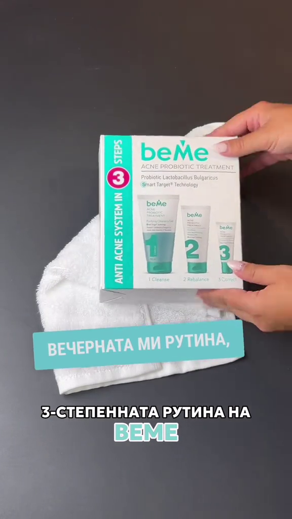 1️⃣ Start from within – Take 2 capsules of beMe DermaBalance daily with water. The formula with probiotic, zinc, and plant extracts helps balance the microbiome and support clearer skin from the inside out.